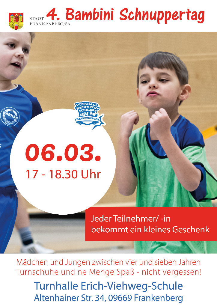 Am Freitag, den 06.03.2020, laden wir alle Kinder von 4 bis 7 Jahren von 17.00 – 18.30 Uhr zu unserem vierten Bambini-Schnuppertag in die Sporthalle der Erich-Viehweg-Oberschule, Altenhainer Str. 34 in 09669 Frankenberg, ein. Neben unseren lizenzierten Nachwuchstrainern warten auch dieses Mal auch einige aktive Spieler unserer ersten Männermannschaft mit spannenden Spielen rund um den Fußball auf die Kids unserer Stadt und es gibt natürlich wieder für jedes Kind eine kleine Überraschung. Fußballschuhe braucht man zum „Schnuppern“ nicht – es reichen Sportsachen und Turnschuhe wie im Kindergarten oder in der Grundschule. Die Fußball-Nachwuchsschmiede Frankenberg/Sa. freut sich dabei auch, ihr Zukunftskonzept interessierten Eltern am Spielfeldrand vorstellen zu dürfen.