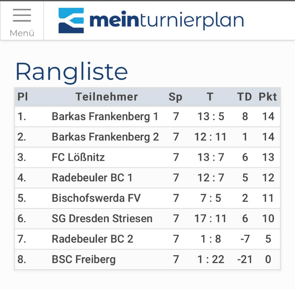 Unsere C-Jugend nahm mit insgesamt 2 Teams am Samstag am Hallenturnier des Radebeuler BC teil. Im Turnierfeld waren der BSC Freiberg, die SG Dresden Striesen, der Bischofswerdaer FV, der FC Lößnitz und ebenfalls zwei Teams des Gastgebers Radebeuler BC vertreten. Im Turniermodus jeder gegen jeden absolvierten unsere Jungs dabei jeweils sieben mega spannende Spiele sehr erfolgreich und belegten am Ende punktgleich mit je 14 Punkten die Tabellenplätze 1 und 2. Dabei hatte vor Turnierbeginn der krankheitsbedingte Ausfall unserer beiden Trainer nur kurz für Unsicherheit gesorgt, denn die Spielereltern übernahmen dankenswerter Weise interimsmäßig die Betreuung unserer Kids. So war am Ende die Freude riesengroß; man darf sich rechtherzlich beim Gastgeber aus Radebeul bedanken, der trotz aller pandemiebedingten Hindernisse ein tolles Turnier für die Kids organisierte.